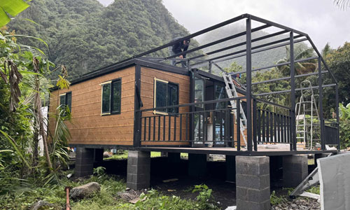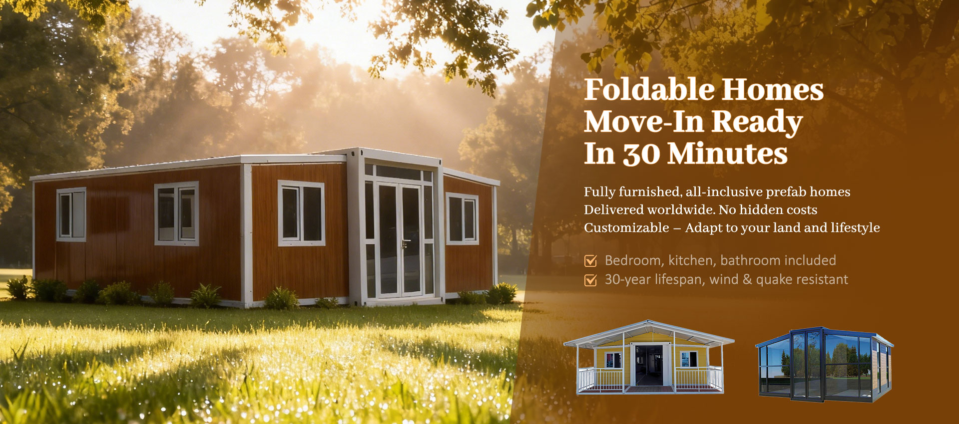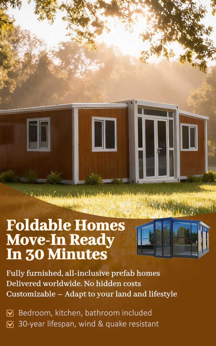 All-Inclusive Package“Your home arrives complete—bedrooms, doors, windows, cabinets, toilet, shower, flooring, electrical sockets, plumbing, and lighting. No extra costs, no surprises.”Built to Endure“Steel frame, hot-dip galvanized, anti-corrosion coating, 75mm EPS insulation, thermal break aluminum windows, double glazing. Resists wind up to Level 10, earthquake Level 8.”Fast & Simple Installation“Designed for rapid assembly. Your home is ready in hours, with minimal labor and no heavy machinery required.”Certified & Customizable“ISO & CE certified. Flexible layouts and sizes, tailored to your site and needs.”